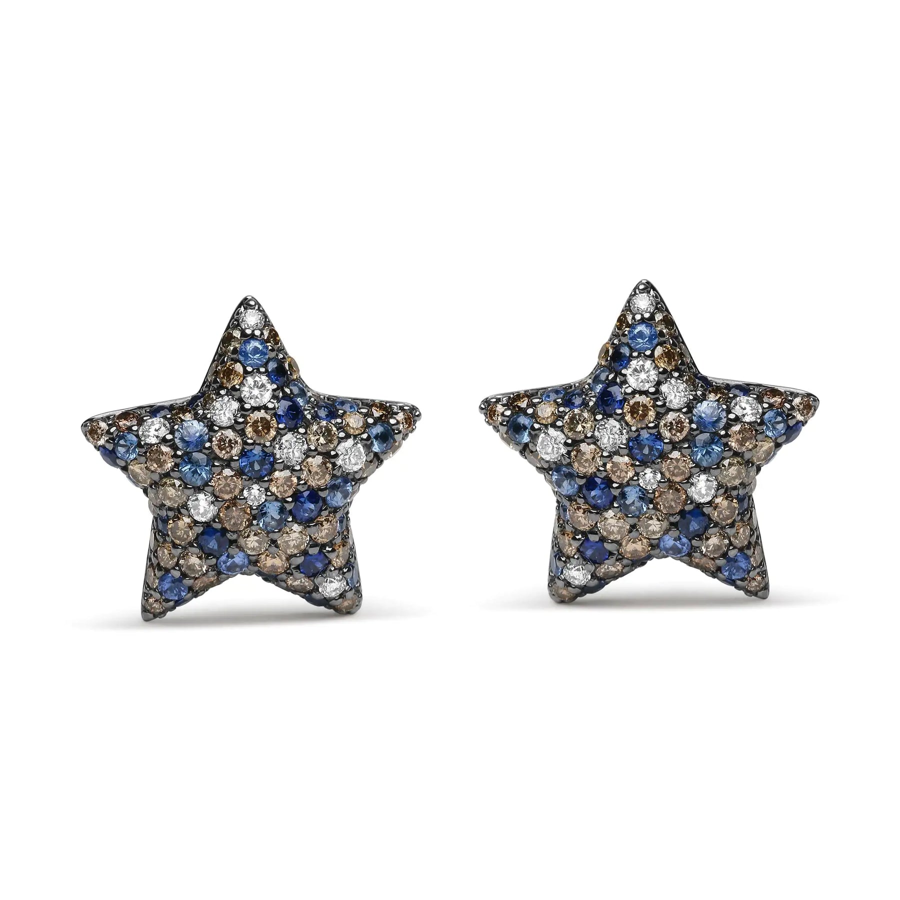 Give your outfits the star treatment by pairing all of your favorite looks with these gorgeous black rhodium plated 18k white gold stud earrings. Showcasing a star shape, this pair dazzles with all-over natural gemstones and diamonds in pave settings. Sparkling 1.3mm round heat-treated blue sapphire gemstones shine bright alongside round diamonds of a total 1.00 cttw and an approximate Brown and G-H Color with SI1-SI2 Clarity. Push back findings secure these dazzling earrings in your ears for comfortable, worry-free wear all day long.