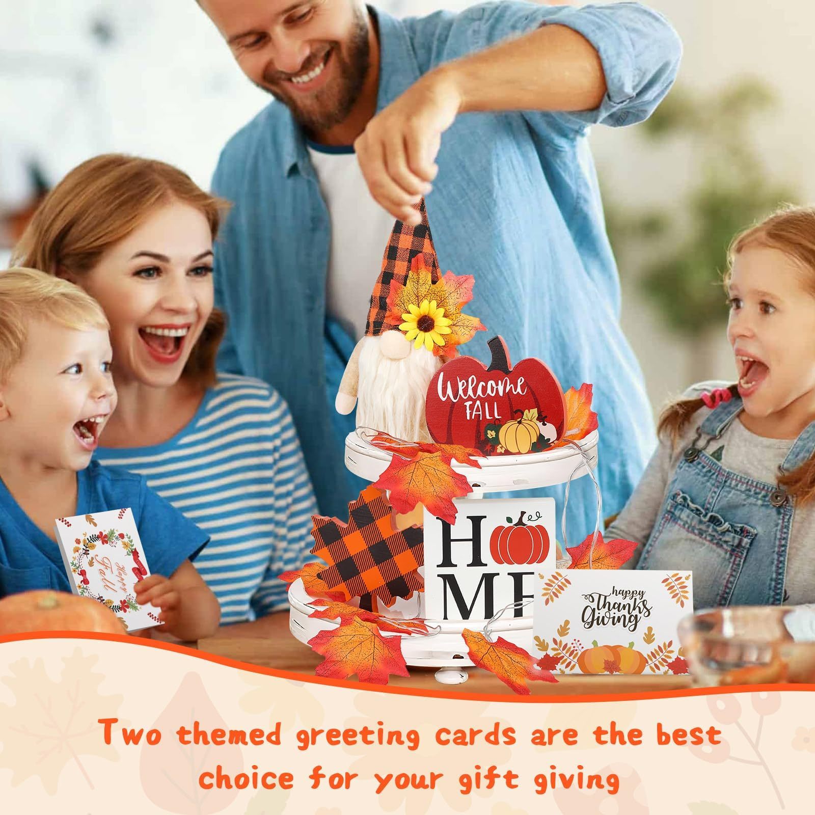 - Package Content: You will receive 5PCS fall tiered tray decorations set, including autumn gnome, 1.5-meter LED maple leaf light, 3 wooden ornaments and 2 autumn and Thanksgiving themed greeting cards, which will meet all your requirements for autumn decoration in one stop. Whether you want to create a warm atmosphere or add festival colors, the fall tiered tray decor set is your ideal choice