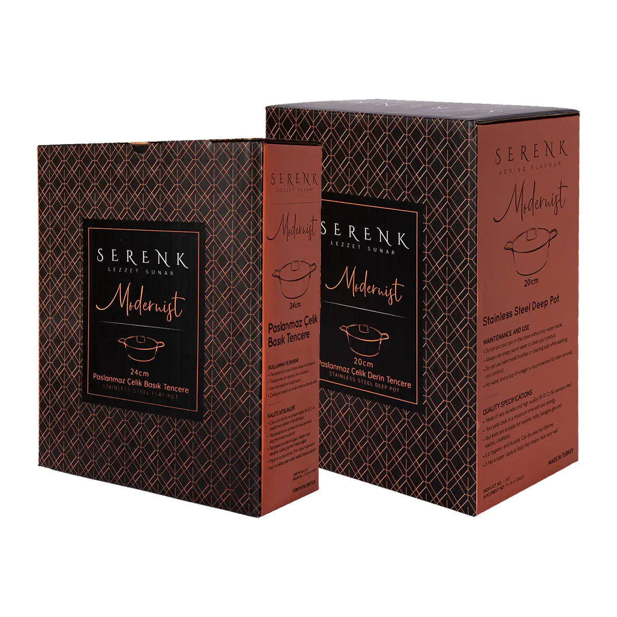 Introducing the Serenk Stainless Steel Cookware Set, featuring the Serenk Saute Pan and the Serenk Stock Pot. Made from 18/10 stainless steel, this cookware set is exceptionally resistant to scratches, staining, and will maintain its beauty and performance for a lifetime. The set offers the durability required by professional kitchens. The saute pan is 2.64 qt, 9.45 inches and 85 oz, the ideal depth make it perfect to use daily. The stock pot is 7.87 inches/20 cm, 84.55 oz/2.5 L. Both pans come with tempered glass lids that lock in true flavor, texture, and nutrients for tender, succulent dishes. The body-extension steel handles offer a safe and secure hold and are safe for metal utensils. The cookware features an encapsulated thermal base with 4.5 mm thickness, making it extremely heat-responsive and able to transfer heat quickly and evenly throughout the pan all the way to the rim. The set is ideal for use on any cooktop, including induction, and is easy to clean. Serenk pans are dishwasher safe, just avoid using steel wool, steel scouring pads, or harsh detergents. Stubborn food residue and stains can be removed with a nylon scrubbing pad and a fine-powdered cleanser. This cookware set is perfect for any home cook or professional chef looking for high-quality, durable and versatile cookware.